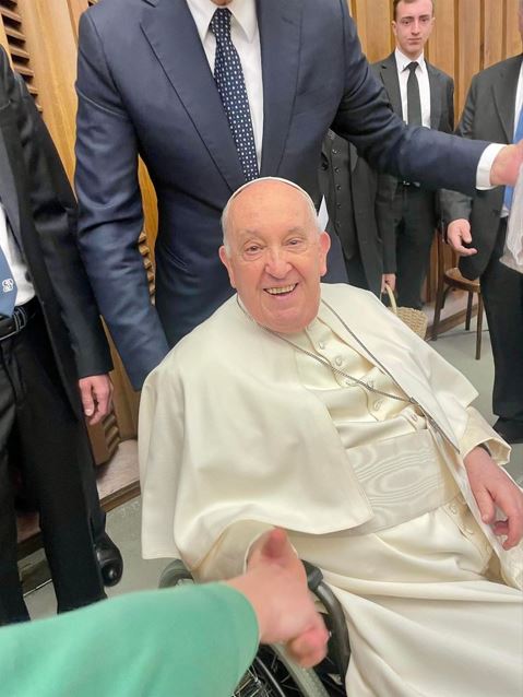 Grandissima emozione, siamo riuscite a stringere la mano del Papa e a porgergli un dono, la nostra stessa felpa sulla quale era riportata la frase “Siamo artigiane ma diventiamo artiste ogni volta che creiamo un abito da sposa”.