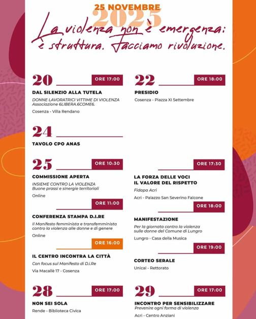 Proprio la connessione con il territorio vedrà il Centro Antiviolenza aderire alle iniziative previste nei comuni di Acri e Lungro, oltre che al corteo serale previsto all’Università della Calabria e che idealmente riprende la partecipata manifestazione “Riprendiamoci la notte” di alcuni anni fa a Cosenza: “La nostra rivoluzione non si ferma, la rivoluzione femminista è la nostra libertà e da qui deve partire un reale processo di trasformazione e cambiamento per dare voce alle donne, per riacquisire dignità, pari diritti e reale possibilità di realizzare la propria autodeterminazione”, conclude la nota.