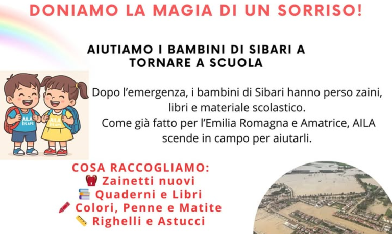 Lāassociazione AILA ā Lotta Abusi, sta promuovendo una raccolta solidale per sostenere i bambini di Sibari colpiti dal recente maltempo Molte famiglie hanno perso tutto,...