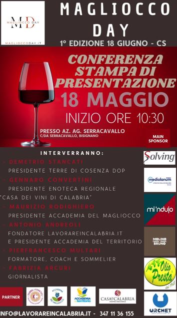 Durante la conferenza stampa, verranno presentati i temi chiave che saranno affrontati durante il Magliocco Day, tra cui il marketing enogastronomico, il management aziendale, l’enoturismo, le nuove tecnologie web applicate al settore e le ultime ricerche nel campo vitivinicolo. Sarà inoltre illustrato il format innovativo dell’evento, che prevede sessioni di approfondimento tecnico, confronto con i produttori e esperti del settore e una sala espositiva dedicata ai vini Magliocco, con la partecipazione di oltre 30 produttori.