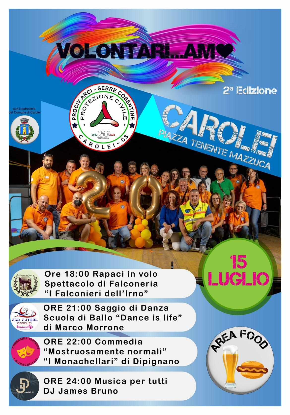 Il 15 luglio a Carolei, in Piazza Tenente Mazzuca, la Prociv Arci “Serre Cosentine” presenterà la Seconda Edizione di “Volontari… Amo”: spettacoli, risate e musica allieteranno la serata