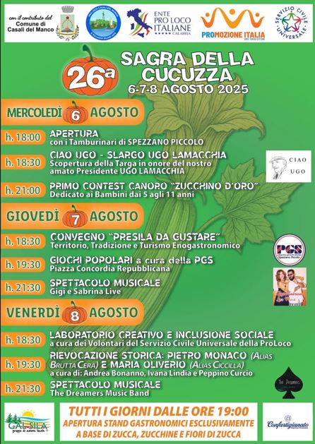 Stand gastronomici aperti ogni giorno dalle ore 19:00, con piatti a base di zucca, zucchine e fiori di zucca, in collaborazione con Confartigianato Cosenza.