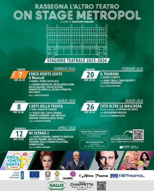 Si alza il sipario sulla nuova stagione della “Rassegna L’Altro Teatro – On Stage Metropol”, che da febbraio ad aprile 2026 porterà sul palco del Cinema Teatro Metropol di Corigliano Rossano commedie, musical, recital d’autore, testi capaci di unire intrattenimento e qualità artistica.