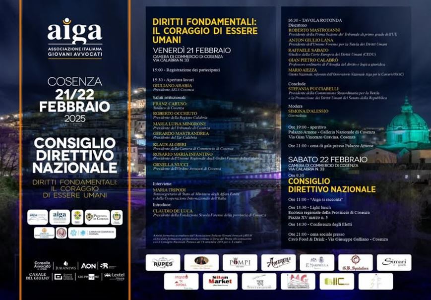 Venerdì 21 e sabato 22 febbraio 2025 si svolgerà a Cosenza il Consiglio Direttivo Nazionale dell’Associazione Italiana Giovani Avvocati (AIGA), con la partecipazione di oltre 250 avvocati provenienti da tutta Italia