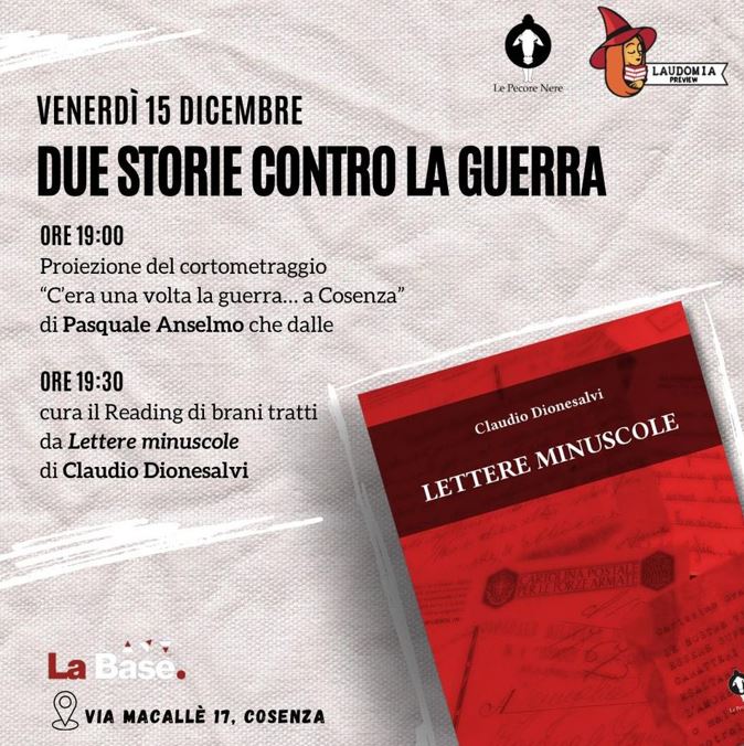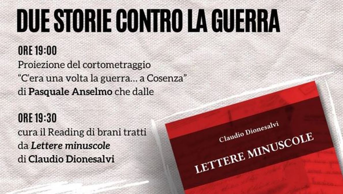 “Proiezione del cortometraggio “C’era una volta la guerra… a Cosenza” di Pasquale Anselmo, noto attore e doppiatore, che a seguire curerà il Reading tratto dal libro “Lettere minuscole” di Claudio Dionesalvi (pubblicato da Le Pecore Nere Editorial).