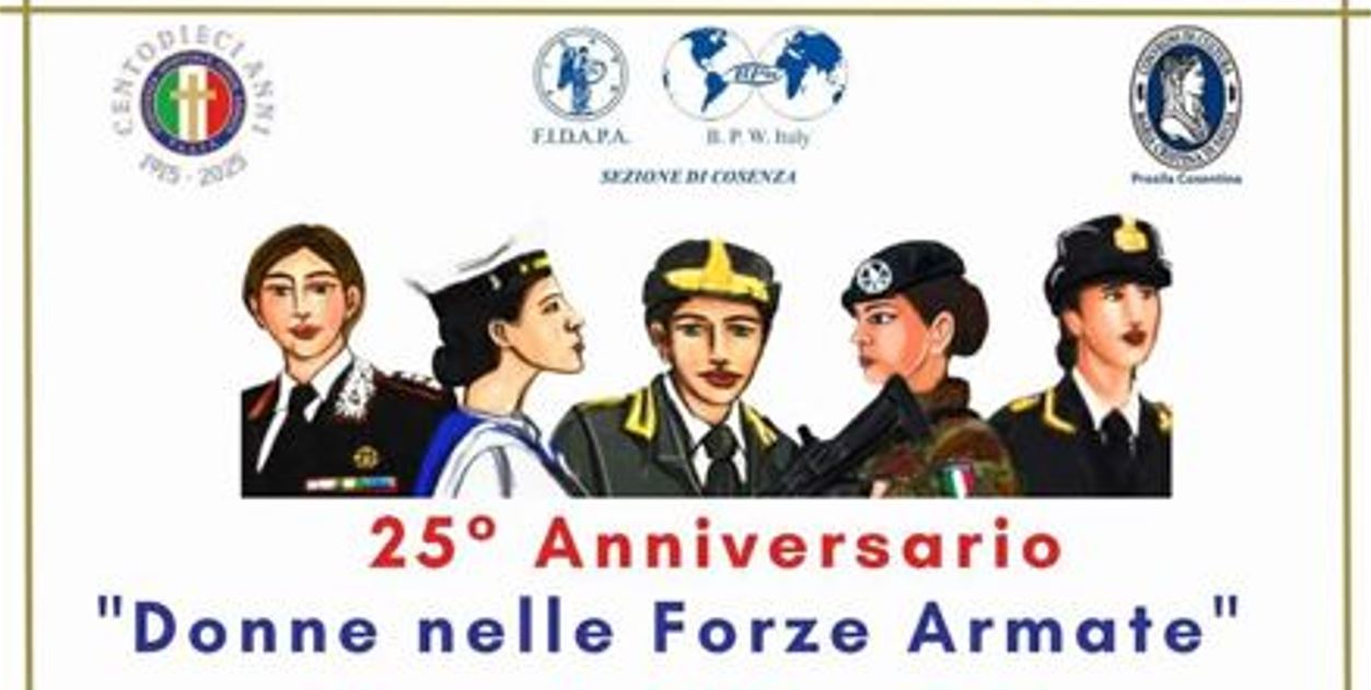 In occasione del 25° anniversario dell’ingresso ufficiale delle donne nelle Forze Armate italiane, le Associazioni PASFA – Sezione di Cosenza, FIDAPA BPW – Sezione di Cosenza e il Convegno di Cultura “Maria Cristina di Savoia” della Presila organizzano un importante momento di riflessione e celebrazione patrocinato dalla Provincia di Cosenza e dal Comune di Cosenza.