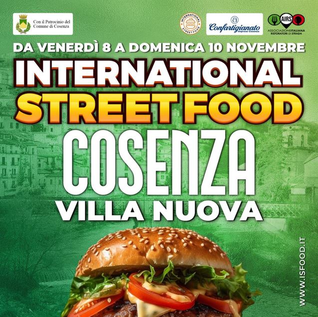 L’International Street Food 2024 sarà a Cosenza presso la Villa Nuova, da venerdì 8 novembre a domenica 10 novembre 2024 ( venerdì ore 18.00-24.00, sabato e domenica ore 12.00-24.00) con il patrocinio del Comune di Cosenza