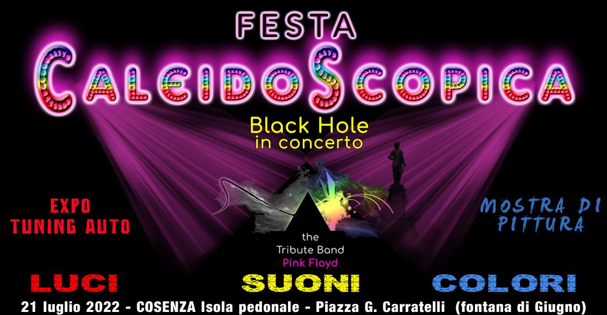 I colori delle opere pittoriche saranno esposte, allo stupore delle luci e dei suoni che si propagheranno da alcune autovetture appartenenti ai clubs di Auto Tunning della provincia di Cosenza, per finire con l’evento conclusivo, lo spettacolo musicale psichedelico dei Black Hole, considerata tra le miglior Tribute Band del sud Italia dei mitici Pink Floyd.