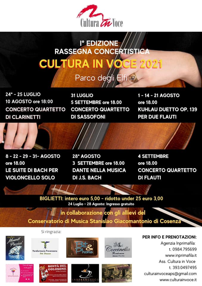 “La Rassegna prevede 15 concerti dal 24 Luglio al 5 Settembre, coinvolge giovani musicisti del Conservatorio di Musica Stanislao Giacomantonio di Cosenza e tanti altri giovani talentuosi del territorio di Marano e paesi limitrofi.