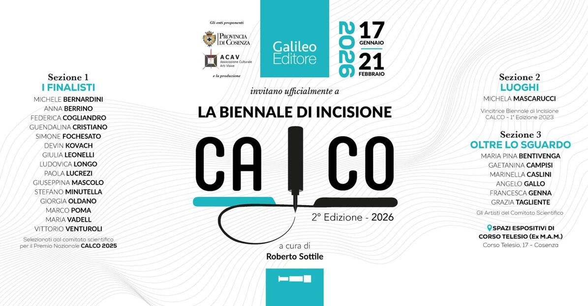 La seconda edizione di CALCO è promossa dalla Provincia di Cosenza e dall’Associazione Culturale Arti Visive (ACAV), con la produzione di Galileo Editore, e si svolgerà presso gli Spazi Espositivi della Provincia di Cosenza in Corso Telesio (Ex M.A.M.), dal 17 gennaio al 21 febbraio 2026