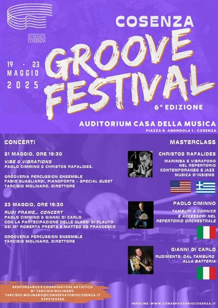 Il Festival organizzato dal Conservatorio “S. Giacomantonio” di Cosenza sotto la direzione artistica dal M° Tarcisio Molinaro, (docente titolare della cattedra di Strumenti a Percussione), è diventato oramai un appuntamento fisso nonché fiore all’occhiello di tutta la programmazione artistica del Conservatorio Giacomantonio, ma anche e soprattutto un appuntamento imperdibile per tutti gli appassionati batteria a percussioni.