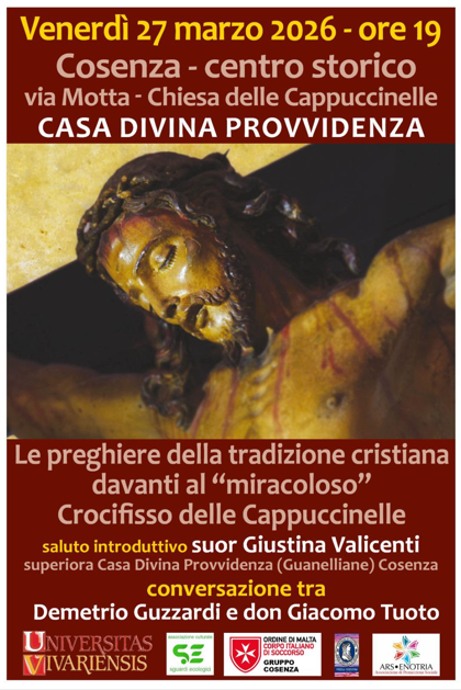 Da tre anni l’Universitas Vivariensis, l’associazione Sguardi ecologici, Ars Enotria, il Convegno di cultura “Maria Cristina di Savoia” della PreSila cosentina e il Corpo italiano di soccorso (CISOM) dell’Ordine di Malta, organizzano una visita alla Chiesa e un momento di preghiera davanti al “miracoloso” Crocifisso delle Cappuccinelle. L’appuntamento è per venerdì 27 marzo 2026 alle ore 19 – Cosenza (centro storico) Chiesa delle Cappuccinelle – Casa Divina Provvidenza; dopo il saluto introduttivo della superiora suor Giustina Valicenti, ci sarà una conversazione tra Demetrio Guzzardi e don Giacomo Tuoto. Quest’anno le tradizionali preghiere davanti a Gesù in croce saranno commentate con brani dell’esortazione apostolica sull’amore verso i poveri di papa Leone XIV, Dilexi te: “Sul volto ferito dei poveri troviamo impresso la sofferenza degli innocenti e, perciò, la stessa sofferenza di Cristo”.