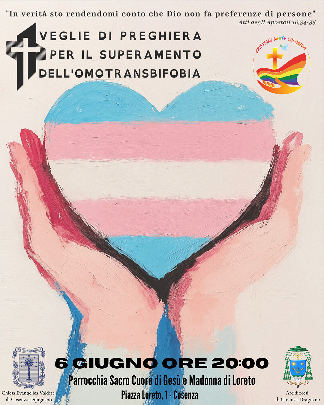 Anche quest’anno si celebrerà a Cosenza la Veglia di preghiera per il superamento dell’omotransbifobia! Questa è già la terza edizione, anche nel 2023 e 2024 l’arcidiocesi aveva dato il patrocinio, ed era stata celebrata dall’Arcivescovo Checchinato.