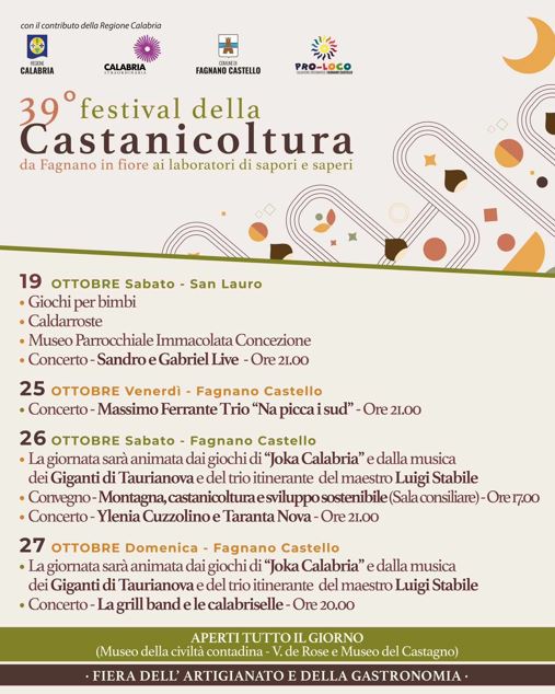 L’Assessore allo spettacolo e al turismo Davide Esposito con l’intera Amministrazione comunale – e con la collaborazione della Pro-Loco Salvatore Orsomarso – è lieta di annunciare la 39esima edizione del Festival della Castanicoltura – sagra delle castagne di Fagnano Castello: 25, 26 e 27 ottobre 2024