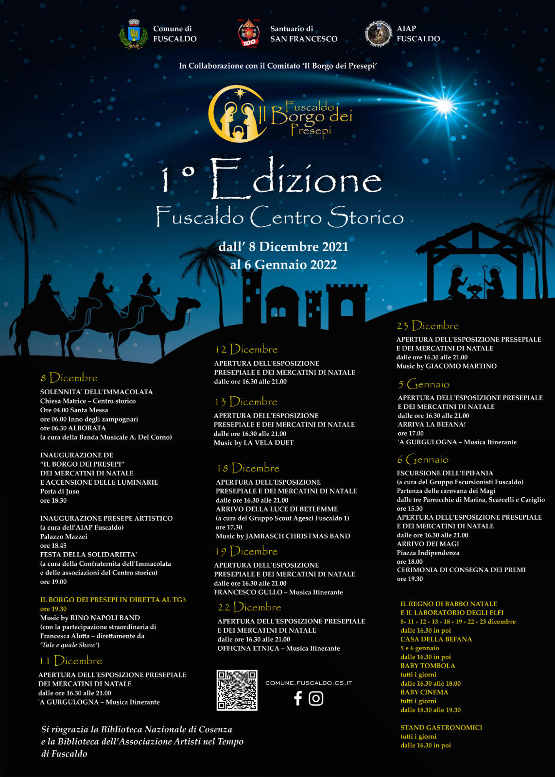 L’energico ed instancabile Comitato de “Il Borgo dei Presepi”, l’associazione “Artisti nel Tempo”, l’associazione italiana amici del Presepio di Fuscaldo, la Biblioteca nazionale di Cosenza, l’Azione Cattolica, il gruppo Scout, l’associazione “Il Faro”, l’associazione “Go’el”, il Gruppo escursionisti Fuscaldo, la Confraternita dell’Immacolata, gli uffici comunali, i singoli volontari e gli sponsor, oltre agli artisti ed a chi animerà la manifestazione nella sua interezza. Venite a visitarci, perché sarà come immergersi in un viaggio nel tempo”.