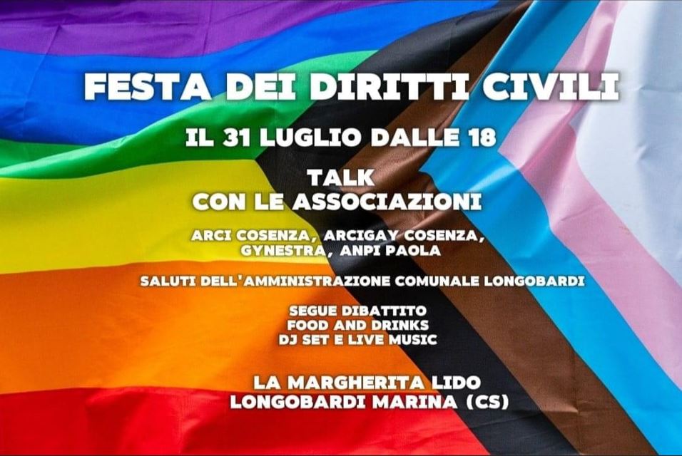 Longobardi (CS), 29 luglio 2024, in risposta ai recenti atti omofobi che hanno scosso la nostra comunità, le associazioni ANPI, Arcigay, Arci Cosenza e Gynestra, organizzano la Festa dei Diritti Civili in collaborazione con il Lido Margherita, a Longobardi Marina
