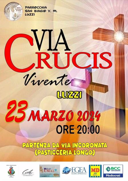 La Comunità Parrocchiale di San Biagio, in collaborazione con le suore dell’Istituto Sant’Antonio di Luzzi, organizza sabato 23 marzo 2024 la Via Crucis Vivente che si terrà per le vie del paese di Luzzi