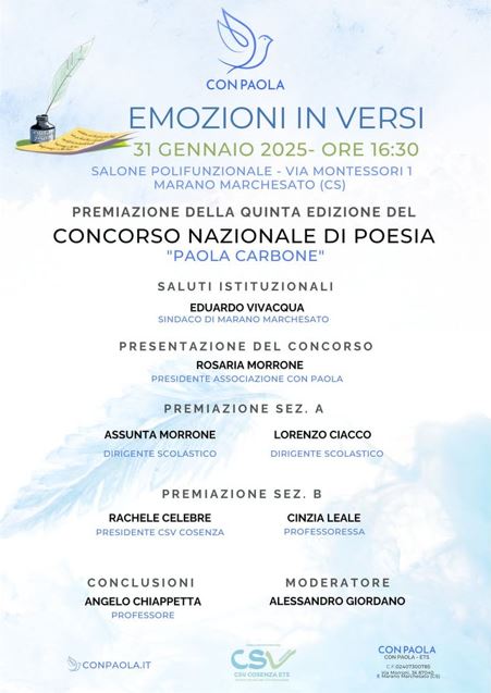 “Emozioni in versi“ è il titolo della premiazione del Concorso di Poesia dedicato a Paola, simbolo di purezza e volto di una umanità capace di donare amore vero e sincero. In questa edizione, la V del Concorso, hanno partecipato 101 poeti provenienti da tutta Italia, e 59 poeti, alunni delle scuole degli istituti comprensivi di Cerisano e Mendicino. Gli autori saranno premiati con premi e menzioni d’onore e di merito, il 31 gennaio 2025 alle ore 16.30 presso il Salone Polifunzionale di Marano Marchesato.