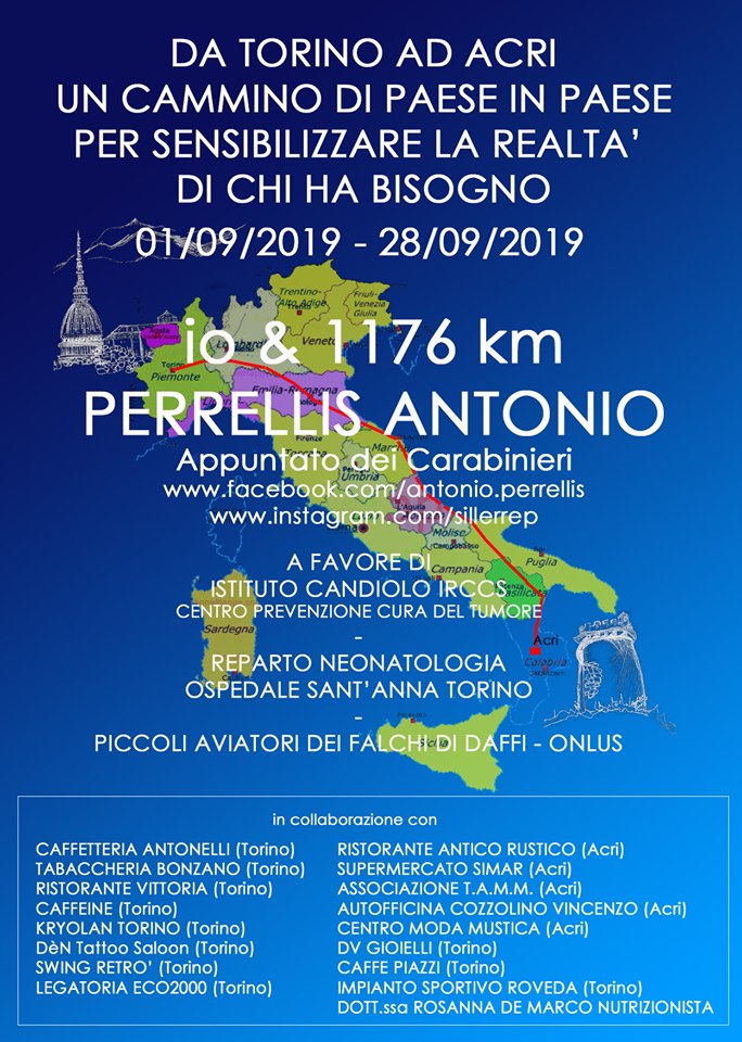 Si chiama Antonio Perrellis, classe ’79, nato ad Acri, oggi Appuntato Scelto dei Carabinieri… il ragazzo che è in viaggio per compiere l’impresa di percorrere a piedi i 1176 km che separano Torino da Acri.