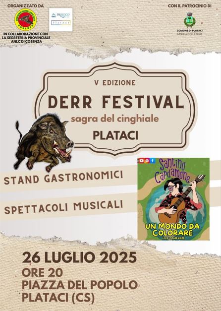 Tradizione, convivialità e musica d’autore si incontrano nella suggestiva cornice di Piazza del Popolo a Plataci per la quinta edizione del DERR FESTIVAL – Sagra del Cinghiale, in programma il 26 luglio 2025 a partire dalle ore 20:00