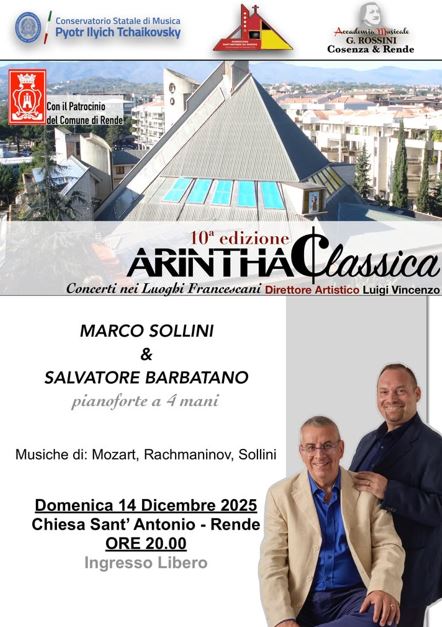 Domenica 14 dicembre alle ore 20, presso la Parrocchia di Sant’Antonio di Rende, si terrà il primo concerto della rassegna concertistica internazionale Arintha Classica, che quest’anno festeggia 10 anni sotto la direzione artistica del M° Luigi Vincenzo
