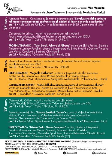Libero Teatro presenta con il sostegno della Fondazione Carical, la seconda edizione del “DramaFest” il 27, 28 e 29 novembre presso il Palacultura Giovanni Paolo II (Rende) Unical. Direzione Artistica: Max Mazzotta