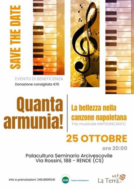 Sabato 25 ottobre, alle ore 20 al Palacultura del seminario arcivescovile di via Rossini a Rende, l’evento di raccolta fondi “Quanta armunia!” della Cooperativa “La Terra” che opera a favore delle persone in difficoltà tramite le sue case di accoglienza e centri polifunzionali per minori e stranieri
