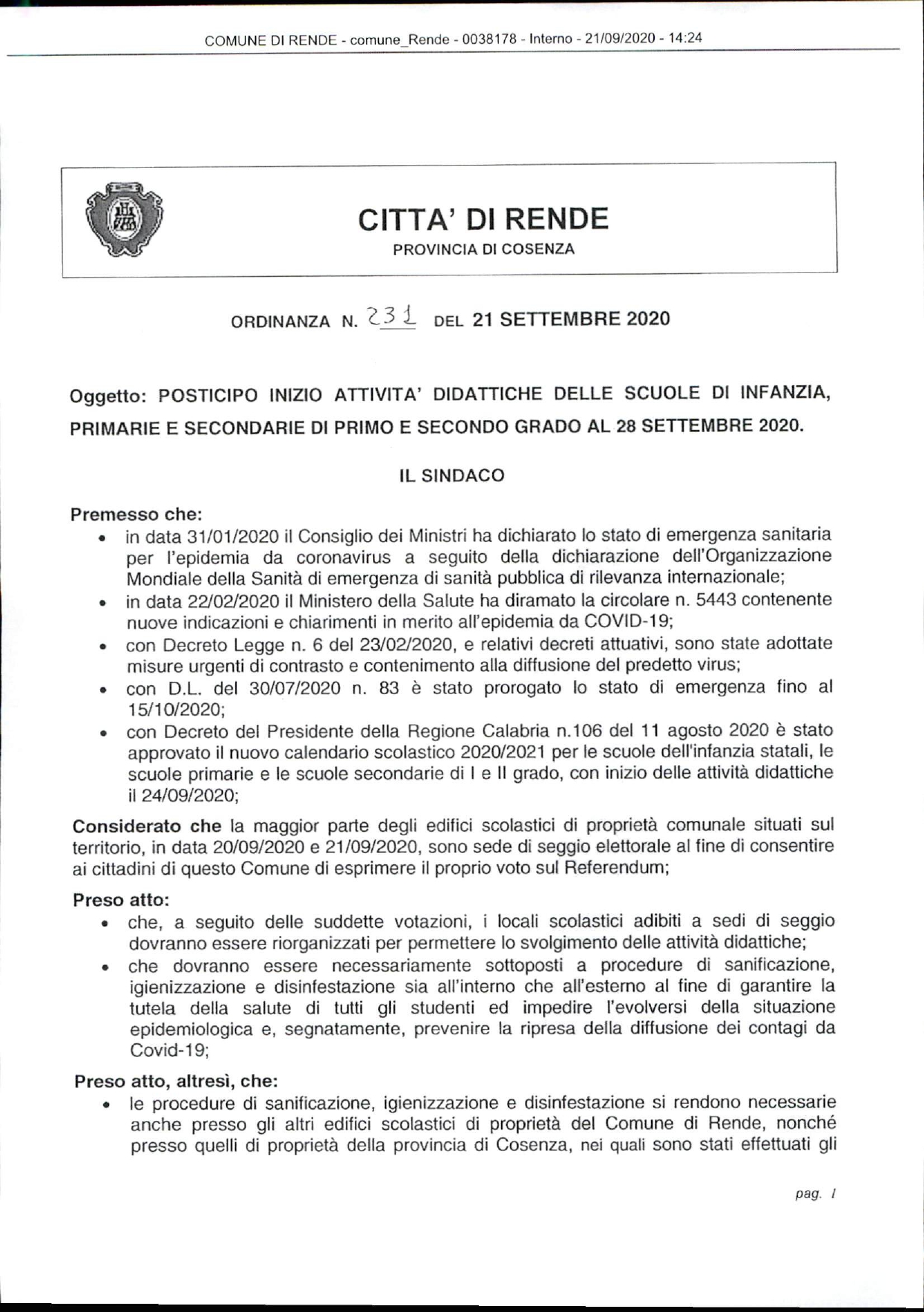 “ORDINANZA N. 231.- POSTICIPO INIZIO ATTIVITA’ DIDATTICHE DELLE SCUOLE DI INFANZIA, PRIMARIE E SECONDARIE DI PRIMO E SECONDO GRADO AL 28 SETTEMBRE 2020.”