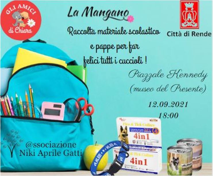 “Andreina Ghionna, Annamaria Artese e Antonella Mangano, con il patrocinio del comune di Rende sono liete di invitare tutti alla raccolta materiale scolastico per i bambini disagiati del nostro territorio
