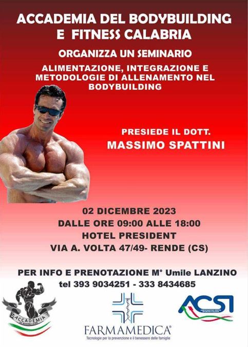 “L’accademia del bodybuilding e del fitness della Calabria organizza un seminario per la prima volta in Calabria e a Cosenza del Dr. Massimo Spattini, Medico Chirurgo, Specializzato in Scienza dell’Alimentazione e Medicina dello Sport, autore acclamato nel mondo dello sport ed atleta di fama internazionale.