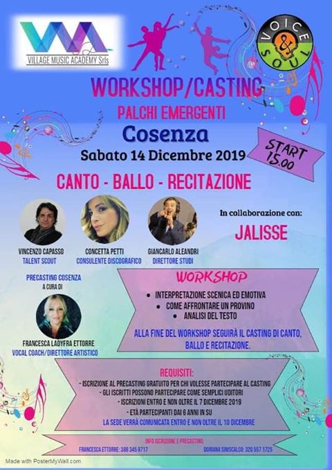 “Il Workshop/Casting è organizzato dall’Associazione Voice & Soul, Centro per la Voce di Francesca LadyFra Ettorre per conto del Village Music Academy (VMA), Associazione impegnata su tutto il territorio nazionale e internazionale, per la promozione degli artisti emergenti.