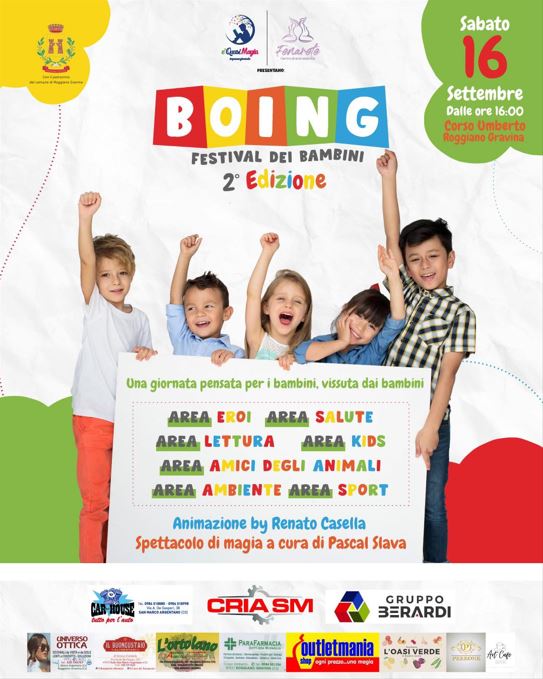 La ludoteca “E’ quasi magia” e l’Associazione di Promozione Sociale “Fenarete” sono liete di presentare la seconda edizione di “Boing – Il festival dei Bambini” che si terrà giorno 16 Settembre 2023 a Roggiano Gravina nelle principali aree del Paese: Piazza Marconi, Piazza Garibaldi e Corso Umberto