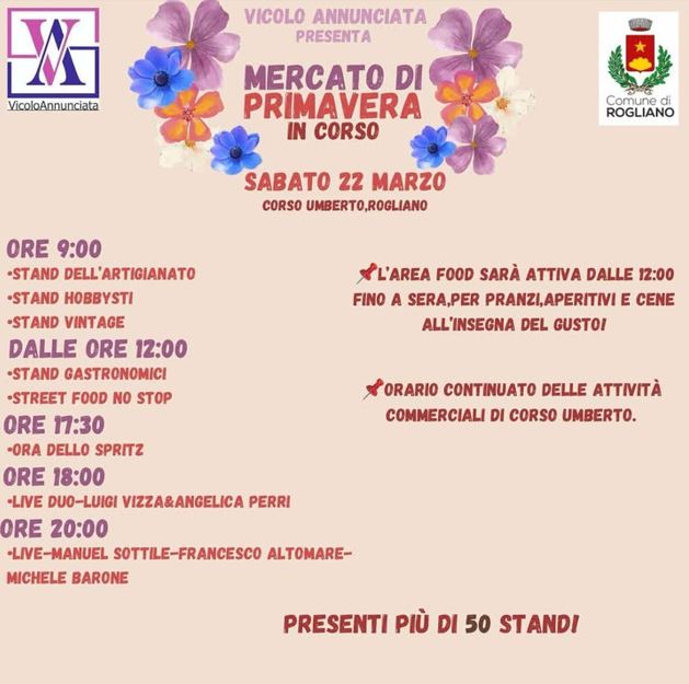Vi invitiamo a partecipare sabato 22 marzo dalle 9.30 fino alle 22, potrete trovare stand di artigianato, hobbisti, street food preparato con passione dai nostri cuochi che gestiscono i migliori ristoranti di Rogliano.