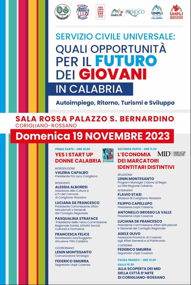 All’evento di approfondimento, che sarà ospitato domenica 19, dalle ore 10 nella Sala Rossa di Palazzo San Bernardino, nel Centro Storico di Rossano parteciperanno le giovani ed i giovani di tutta la provincia partecipanti al Servizio, accompagnati dai presidenti e dagli operatori delle Pro Loco di Belmonte Calabro, Carolei, Cerchiara di Calabria, Corigliano-Rossano, Longobardi, Marzi, Piane, Roggiano Gravina, San Lucido, San Vincenzo La Costa, Sant’Agata d’Esaro, Sangineto, Scalea, Verbicaro. – Patrocinato dal Comune di Corigliano – Rossano e promosso dall’UNPLI – Unione Proloco Italiane, l’evento di informazione e formazione, attraverso due sessioni coordinate entrambe da Federico Smurra, Segretario dell’Unpli Calabria e formatore dell’Unpli nazionale, approfondirà in particolare due progetti interconnessi al Servizio Civile Generale: Yes I Start Up Donne Calabria e i Marcatori Identitari Distintivi (MID) della Calabria Straordinaria.