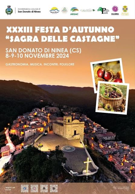 A San Donato di Ninea, piccolo borgo nel Parco Nazionale del Pollino, l’8-9-10 novembre si celebra la ormai conosciutissima Festa D’Autunno, Sagra delle Castagne, arrivata alla 33°edizione