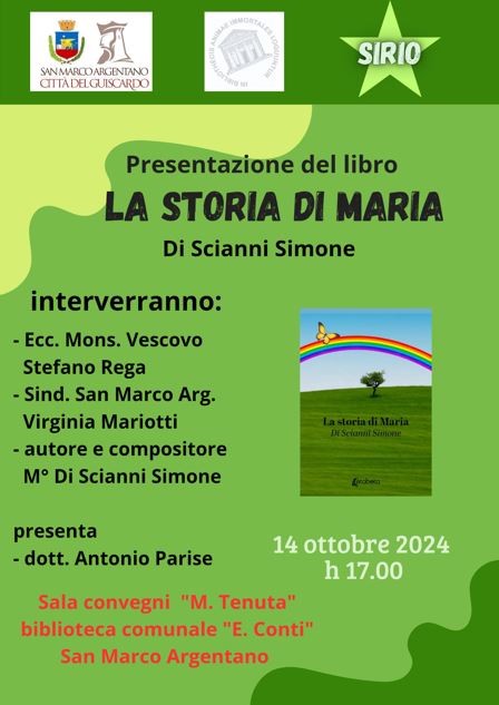 Oggi 14 ottobre alle h 17, presentazione del libro “La storia di Maria” presso la biblioteca comunale di San Marco Argentano, presente anche il vescovo Mons. Stefano Rega autore dell’introduzione del libro