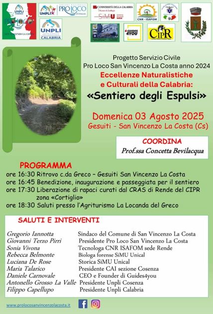A San Vincenzo La Costa, piccolo borgo cosentino, domenica 3 agosto 2025, sarà inaugurato il “Sentiero degli Espulsi”, un percorso naturalistico e culturale promosso dalla Pro Loco di San Vincenzo La Costa nell’ambito del Progetto di Servizio Civile 2024, dal titolo “Eccellenze Naturalistiche e Culturali della Calabria”