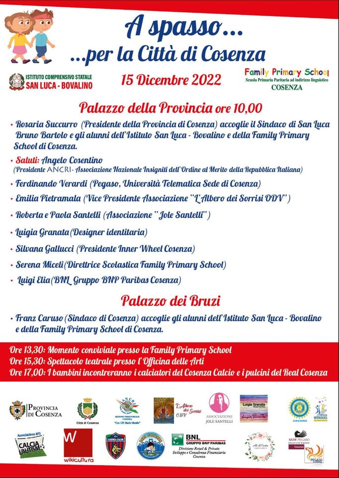 Nel pomeriggio, alle 15:30, l’intensa giornata, ricca di emozioni e di scoperte, proseguirà con uno spettacolo teatrale presso l’Officina delle arti e, a seguire, alle ore 17:00, si concluderà con un’altra opportunità di crescita relazionale, quando gli alunni delle due scuole incontreranno i calciatori del Cosenza calcio e i pulcini del Real Cosenza.”