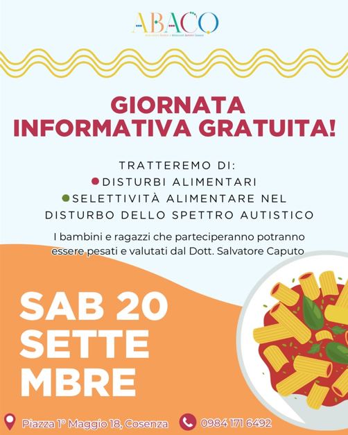 Abaco organizza una giornata informativa gratuita sui disturbi alimentari, con un focus speciale sulla selettività alimentare nel disturbo dello spettro autistico, insieme al Dott. Salvatore Caputo.