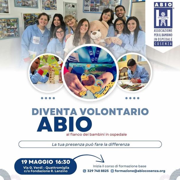 Lunedì 19 maggio 2025 dalle 16:30 presso Fondazione R. Lanzino (Via Verdi- Quattromiglia), si terrà l’incontro conoscitivo dell’Associazione ABIO.