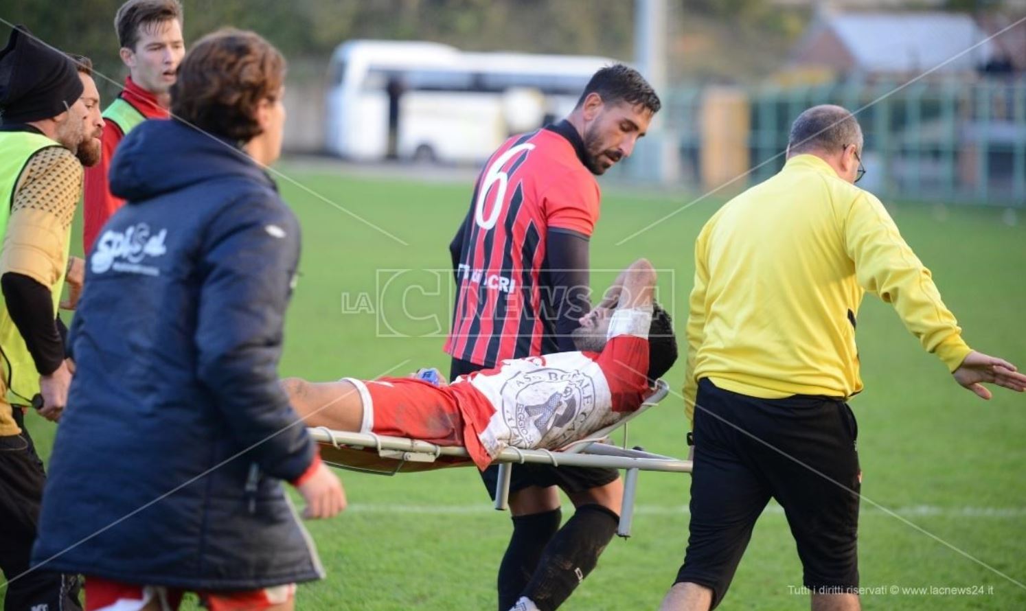 “L’attaccante ospite rimane esanime a terra dopo uno scontro di gioco ma a bordo campo non c’era alcun mezzo di soccorso perchè impegnato nel comune di Bisignano. Decisivo l’intevento di un compagno di squadra e del medico”