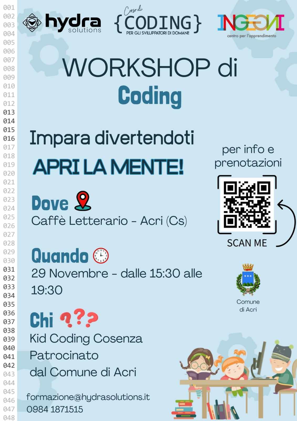 Il workshop di Coding per ragazzi, un evento organizzato da Hydra Solutions e patrocinato dal comune di Acri, si terrà presso il Caffè Letterario di Acri, il 29 novembre dalle ore 15:30 alle 19:30 e sarà rivolto ai ragazzi dai 6 ai 17 anni.
