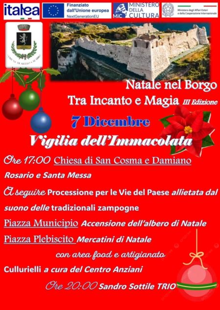 alle ore 17:00 presso la Chiesa di San Cosma e Damiano avrà luogo la recita del Rosario e la Santa Messa; a seguire si terrà la processione della Madonna Immacolata per le Vie del Paese, con partenza dalla Chiesa di San Cosma e Damiano, allietata dal suono delle tradizionali zampogne.