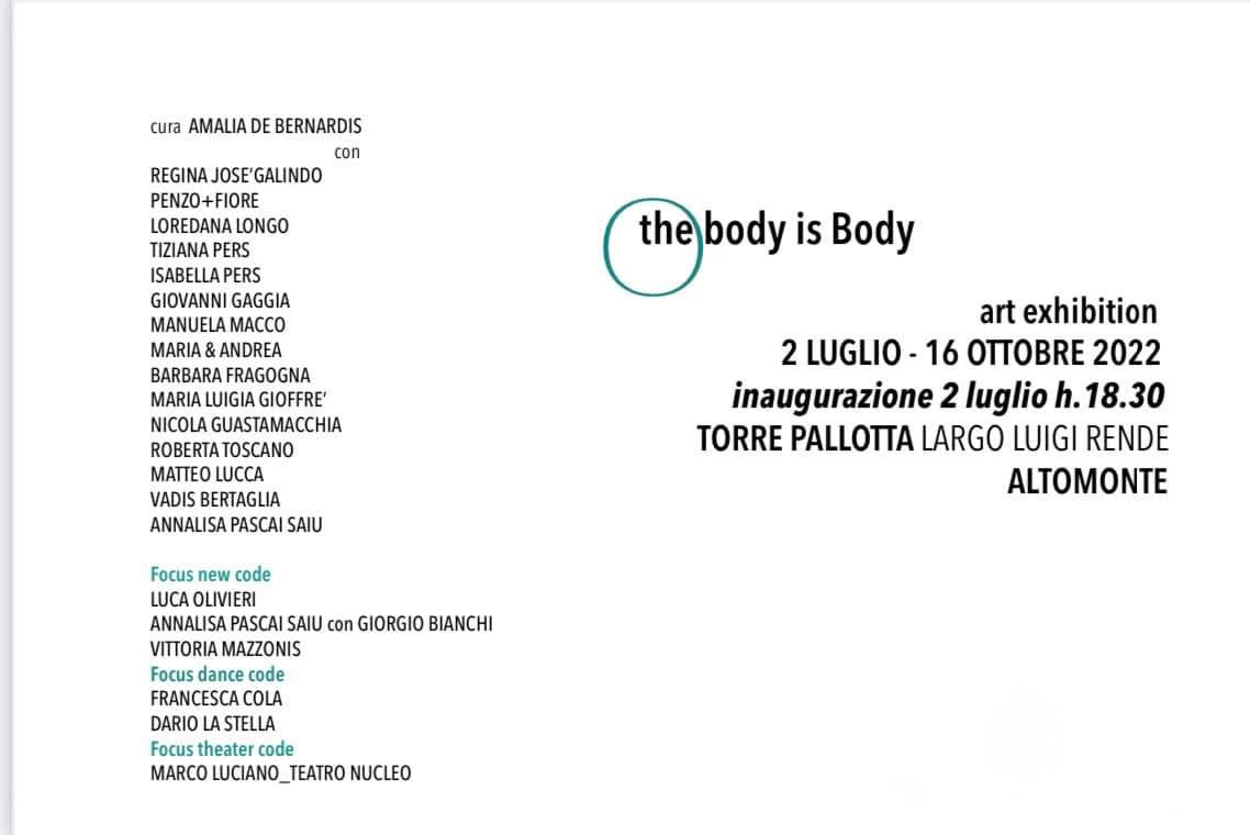 La mostra “_the body is Body_” rientra nel cartellone del Festival Euromediterraneo di Altomonte 2022, iniziativa fortemente voluta dal sindaco Gianpietro Coppola con il supporto dell’assessore alle Attività Culturali Elvira Berlingieri, dell’assessore alle Pari Opportunità Emilia Romeo, dell’assessore al Turismo Mario Pancaro e della direzione artistica del Festival.”