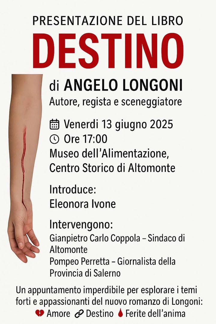 Il programma della manifestazione si preannuncia ricco e coinvolgente, inizierà venerdì 13 giugno c.a. alle ore 17:00 presso il Museo dell’Alimentazione con la presentazione “Destino”, ultimo libro scritto dal compianto Angelo Longoni, scrittore, sceneggiatore, regista e produttore, a presentarlo sarà la bella e brava attrice e regista Eleonora Ivone coadiuvata dal Sindaco di Altomonte Gianpietro Carlo Coppola e dal giornalista Pompeo Perretta, un’occasione imperdibile per immergersi nei temi forti e appassionati di questo ultimo scritto di Angelo Longoni, un’esplorazione attenta e profonda di amore, destino e ferite dell’anima.