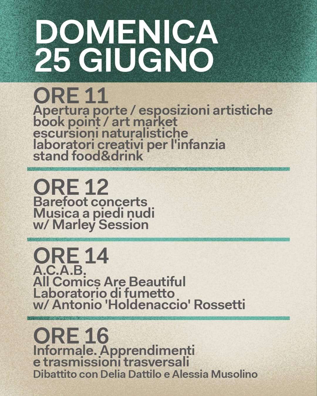 “Un programma vasto e articolato che mescola, con sapienza e passione, molteplici forme di espressione artistica, dalla musica alla filosofia, dal teatro all’arte digitale, dal fumetto all’artigianato, dall’illustrazione ai laboratori creativi per l’infanzia, dai momenti di riflessione alle escursioni naturalistiche, il tutto condito da ottimo cibo a km 0, birra artigianale del territorio, vino biologico e liquori locali, per rilassare la mente e far godere anche il corpo.