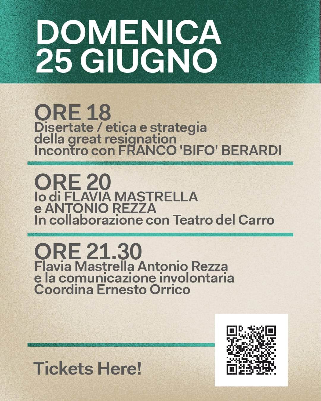 Tra gli ospiti più importanti, spiccano i concerti di DJ GRUFF, icona della musica hip hop vecchia scuola, e dei FINE BEFORE YOU CAME, apprezzata band della scena post hardcore di casa nostra; la filosofia sarà rappresentata da Franco BIFO Berardi, uno dei più importanti agitatori culturali e scrittori del nostro Paese, mentre il teatro vedrà protagonista il mattatore ANTONIO REZZA, già Leone d’Argento alla carriera in quel di Venezia.