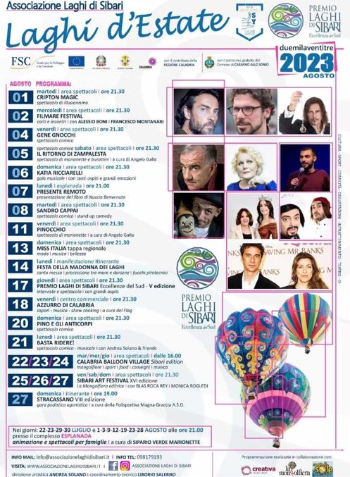 Nell’ordine: lo spettacolo di illusionismo Cripton magic (1 agosto), il Filmare Festival (2 agosto), lo show comico di Gene Gnocchi, Alessio Boni e Francesco Montanari (4), le marionette di Angelo Gallo (5 e 11 agosto), il gala musicale con Katia Ricciarelli (6), la presentazione del libro della scrittrice Nuccia Benvenuto (7), la stand up comedy di Sandro Cappai (8), la tappa regionale di Miss Italia (13), la festa della Madonna dei Laghi (14), la quinta edizione del premio Laghi di Sibari (17), lo show cocking marinaro (18), l’ora delle risate (20 e 21). E poi, ancora, spazio alle mongolfiere del Balloon Village (dal 22 al 24 agosto), al Sibari art Festival (dal 25 al 27) e, dulcis in fundo, all’ottava edizione della gara podistica StraCassano (27).