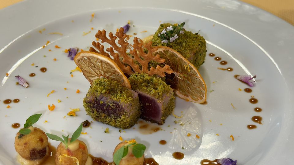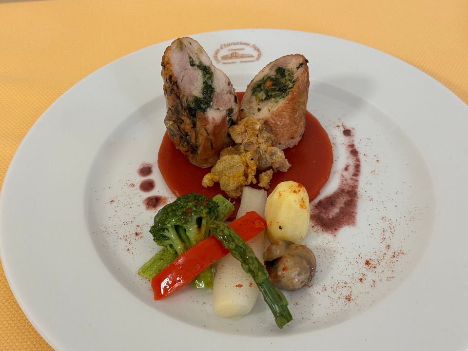 Il menù dei ragazzi ha previsto delle cialde speziate di quinoa, croccante alla Cipolla Rossa di Tropea IGP e Nduja. Riso Carnaroli di Sibari Magisa al cedro con velo di gambero rosso cassanese. Involtino di pollo Kabir con verdure confit ed estratto di pomodoro solidificato. Dessert di Ricotta e pera muscatiello con nocciola tonda di Calabria, il tutto accompagnato da un “Capo Tonic 2.0”
