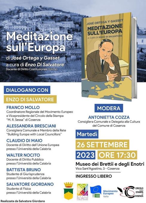 “A pochi giorni dal tradizionale discorso sullo Stato dell’Unione durante la sessione plenaria al Parlamento europeo a Strasburgo, tenutasi il 13 settembre 2023, dalla Presidente della Commissione europea Ursula von der Leyen e a 250 giorni dalle elezioni del Parlamento Europeo, fissate per il 9 giugno del 2024, è stata organizzata un riflessione sullo stato dell’UE con la presentazione Martedì 26 settembre, alle ore 17:30 presso il Museo dei Brettii e degli Enotri la presentazione del volume “Meditazione sull’Europa” di José Ortega y Gasset a cura di Enzo Di Salvatore.